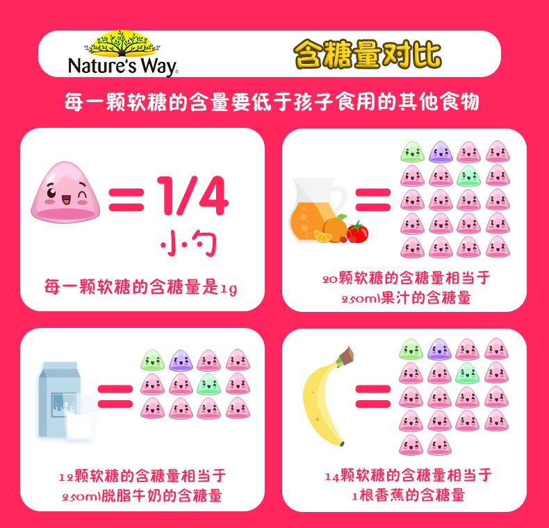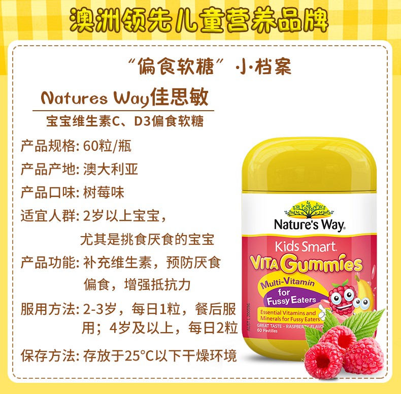 很多宝宝有挑食的毛病,尤其不喜欢蔬菜,容易缺乏成长所需的维生素。Nature’s Way佳思敏多维果汁软糖有9种重要维生素及几种蔬菜萃取精华,能为孩子补充所缺的维生素,均衡营养,有助增强体质。美味莓子口味,非常可口,不会太甜,不会黏牙,不用担心腐蚀牙齿。宝宝们天生爱吃糖,一定会爱上它!