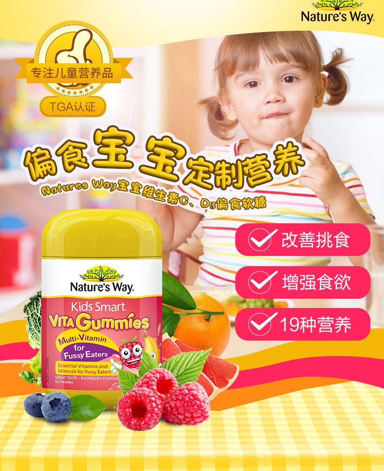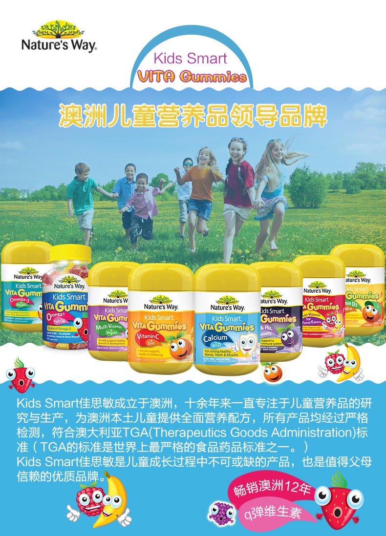 Nature’s Way是澳大利亚著名的健康产品品牌,隶属于澳洲最大的消费品公司Pharmacare,他们充分发挥澳大利亚纯净无污染的优势,竭尽可能的使用最纯净的天然成分;避免使用人工色素,防腐剂;避免使用蔗糖(可能导致肥胖和蛀牙)、麸质(可能导致过敏)、乳糖(可能导致腹泻)等成分.