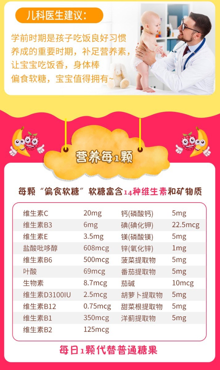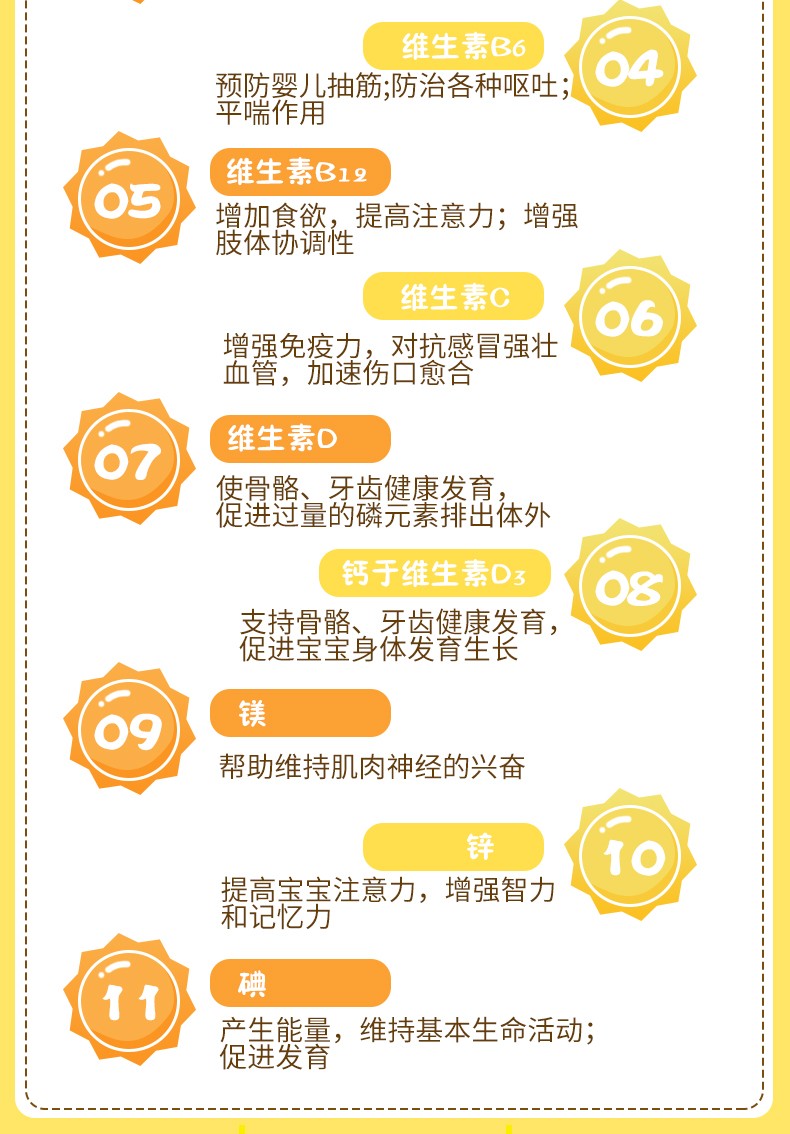 此产品含有宝宝成长必需的维他命和矿物质,以用来填补因挑食而造成的营养缺失